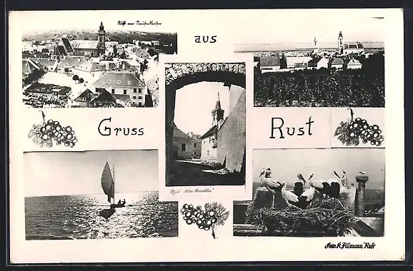 AK Rust, Altes Stadttor, Storchennest, Segelboot und Totalansicht