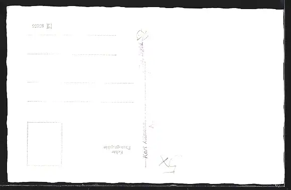 Personenbezogene Daten auf der Rückseite der Karte wurden durch blauen Textmarker unkenntlich gemacht. Die blauen Stellen sind auf die Vorderseite durchgeweicht und wirken sich negativ auf das Postkartenfoto aus