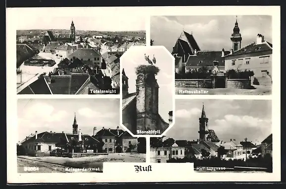 AK Rust, Gasthaus Rathauskeller, Storchidyll, Kriegerdenkmal