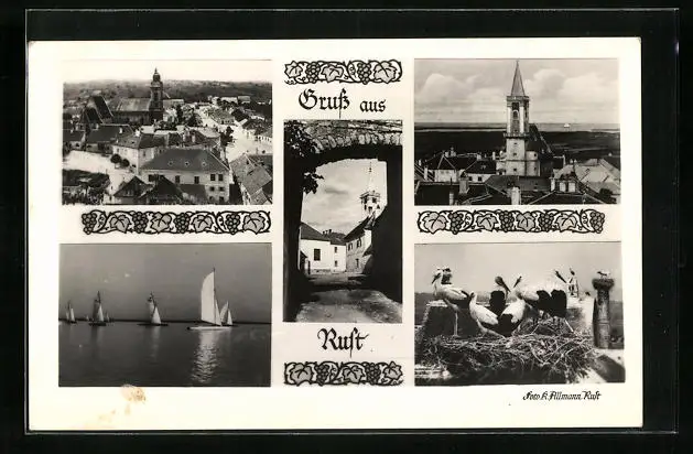 AK Rust, Teilansicht aus der Vogelschau, Storchennest, See mit Segelbooten