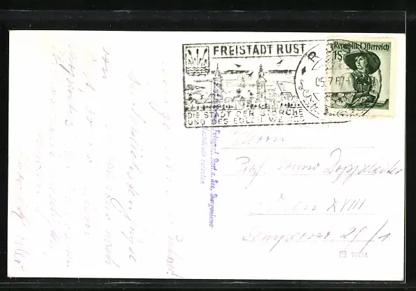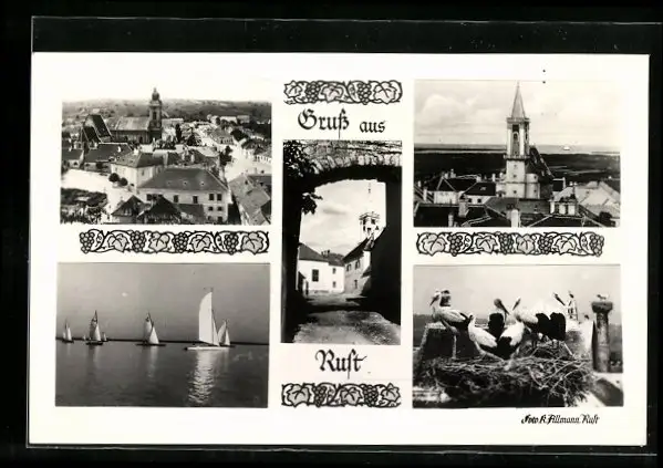 AK Rust, Teilansicht mit Kirche, Ortspartie durch Tor, Störche im Nest