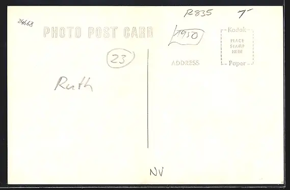 Personenbezogene Daten auf der Rückseite der Karte wurden durch blauen Textmarker unkenntlich gemacht. Die blauen Stellen sind auf die Vorderseite durchgeweicht und wirken sich negativ auf das Postkartenfoto aus