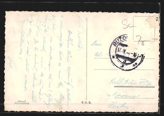 Personenbezogene Daten auf der Rückseite der Karte wurden durch blauen Textmarker unkenntlich gemacht. Die blauen Stellen sind auf die Vorderseite durchgeweicht und wirken sich negativ auf das Postkartenfoto aus