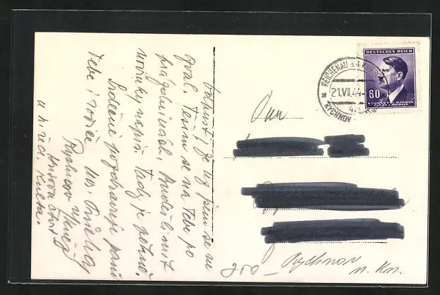 Personenbezogene Daten auf der Rückseite der Karte wurden durch blauen Textmarker unkenntlich gemacht. Die blauen Stellen sind auf die Vorderseite durchgeweicht und wirken sich negativ auf das Postkartenfoto aus