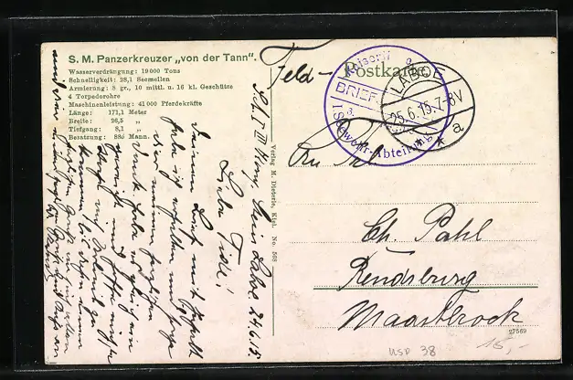 Personenbezogene Daten auf der Rückseite der Karte wurden durch blauen Textmarker unkenntlich gemacht. Die blauen Stellen sind auf die Vorderseite durchgeweicht und wirken sich negativ auf das Postkartenfoto aus