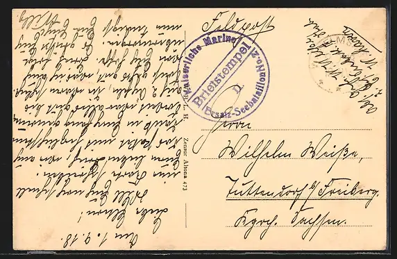 Personenbezogene Daten auf der Rückseite der Karte wurden durch blauen Textmarker unkenntlich gemacht. Die blauen Stellen sind auf die Vorderseite durchgeweicht und wirken sich negativ auf das Postkartenfoto aus