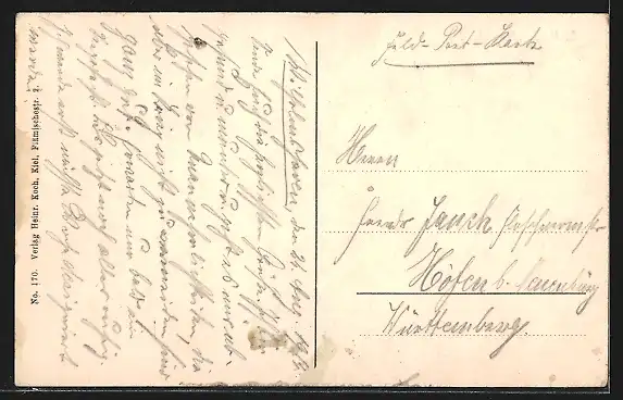 Personenbezogene Daten auf der Rückseite der Karte wurden durch blauen Textmarker unkenntlich gemacht. Die blauen Stellen sind auf die Vorderseite durchgeweicht und wirken sich negativ auf das Postkartenfoto aus