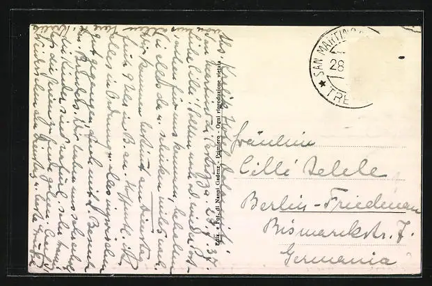 Personenbezogene Daten auf der Rückseite der Karte wurden durch blauen Textmarker unkenntlich gemacht. Die blauen Stellen sind auf die Vorderseite durchgeweicht und wirken sich negativ auf das Postkartenfoto aus