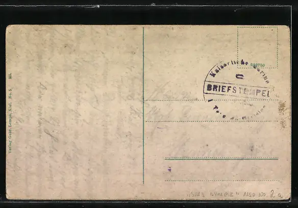 Personenbezogene Daten auf der Rückseite der Karte wurden durch blauen Textmarker unkenntlich gemacht. Die blauen Stellen sind auf die Vorderseite durchgeweicht und wirken sich negativ auf das Postkartenfoto aus