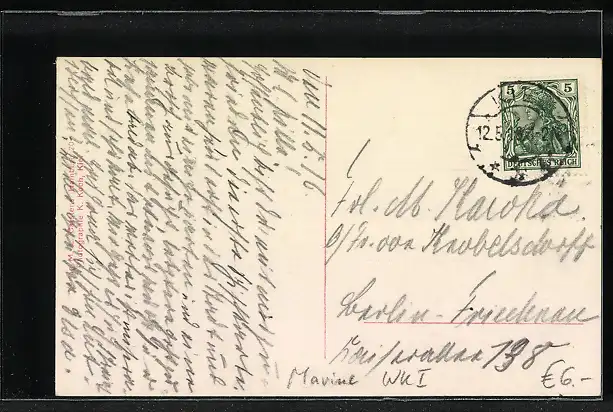 Personenbezogene Daten auf der Rückseite der Karte wurden durch blauen Textmarker unkenntlich gemacht. Die blauen Stellen sind auf die Vorderseite durchgeweicht und wirken sich negativ auf das Postkartenfoto aus