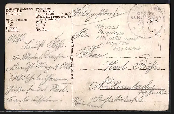 Personenbezogene Daten auf der Rückseite der Karte wurden durch blauen Textmarker unkenntlich gemacht. Die blauen Stellen sind auf die Vorderseite durchgeweicht und wirken sich negativ auf das Postkartenfoto aus