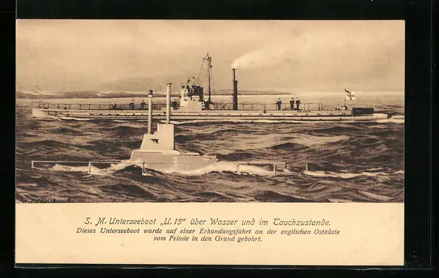 AK SM U-Boot U.15 über Wasser und im Tauchzustand
