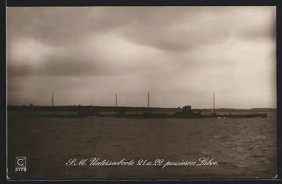 AK SM Unterseeboote 21 und 22 passieren Laboe