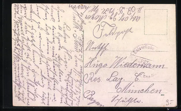 Personenbezogene Daten auf der Rückseite der Karte wurden durch blauen Textmarker unkenntlich gemacht. Die blauen Stellen sind auf die Vorderseite durchgeweicht und wirken sich negativ auf das Postkartenfoto aus