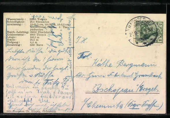 Personenbezogene Daten auf der Rückseite der Karte wurden durch blauen Textmarker unkenntlich gemacht. Die blauen Stellen sind auf die Vorderseite durchgeweicht und wirken sich negativ auf das Postkartenfoto aus