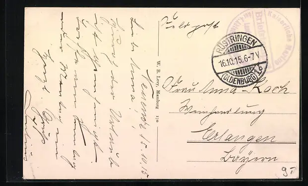 Personenbezogene Daten auf der Rückseite der Karte wurden durch blauen Textmarker unkenntlich gemacht. Die blauen Stellen sind auf die Vorderseite durchgeweicht und wirken sich negativ auf das Postkartenfoto aus