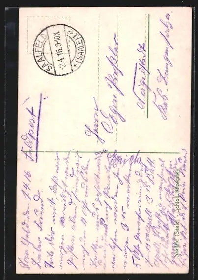 Personenbezogene Daten auf der Rückseite der Karte wurden durch blauen Textmarker unkenntlich gemacht. Die blauen Stellen sind auf die Vorderseite durchgeweicht und wirken sich negativ auf das Postkartenfoto aus