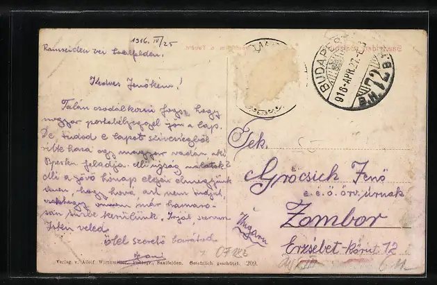 Personenbezogene Daten auf der Rückseite der Karte wurden durch blauen Textmarker unkenntlich gemacht. Die blauen Stellen sind auf die Vorderseite durchgeweicht und wirken sich negativ auf das Postkartenfoto aus
