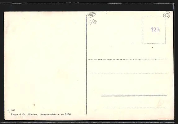 Personenbezogene Daten auf der Rückseite der Karte wurden durch blauen Textmarker unkenntlich gemacht. Die blauen Stellen sind auf die Vorderseite durchgeweicht und wirken sich negativ auf das Postkartenfoto aus