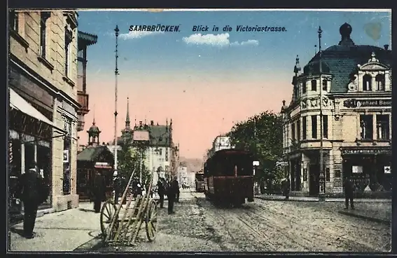 AK Saarbrücken, Abendstimmung in der Victoriastrasse, Strassenbahn