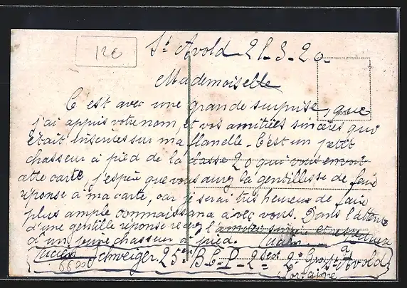 Personenbezogene Daten auf der Rückseite der Karte wurden durch blauen Textmarker unkenntlich gemacht. Die blauen Stellen sind auf die Vorderseite durchgeweicht und wirken sich negativ auf das Postkartenfoto aus