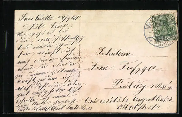 Personenbezogene Daten auf der Rückseite der Karte wurden durch blauen Textmarker unkenntlich gemacht. Die blauen Stellen sind auf die Vorderseite durchgeweicht und wirken sich negativ auf das Postkartenfoto aus