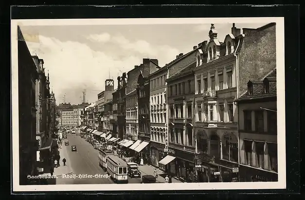 AK Saarbrücken, Blick in die Strasse mit Strassenbahn
