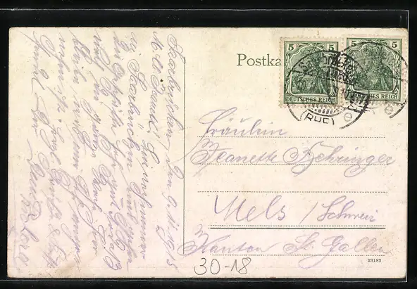 Personenbezogene Daten auf der Rückseite der Karte wurden durch blauen Textmarker unkenntlich gemacht. Die blauen Stellen sind auf die Vorderseite durchgeweicht und wirken sich negativ auf das Postkartenfoto aus