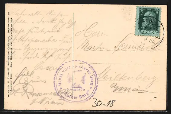 Personenbezogene Daten auf der Rückseite der Karte wurden durch blauen Textmarker unkenntlich gemacht. Die blauen Stellen sind auf die Vorderseite durchgeweicht und wirken sich negativ auf das Postkartenfoto aus