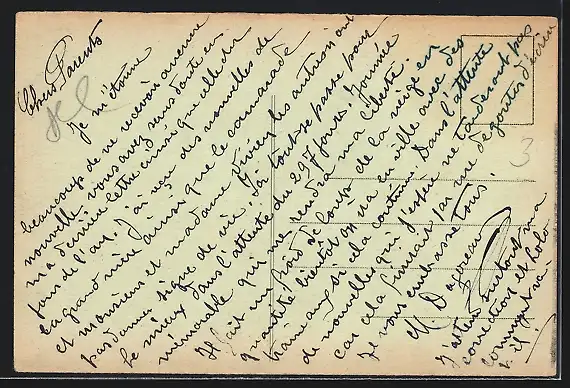 Personenbezogene Daten auf der Rückseite der Karte wurden durch blauen Textmarker unkenntlich gemacht. Die blauen Stellen sind auf die Vorderseite durchgeweicht und wirken sich negativ auf das Postkartenfoto aus