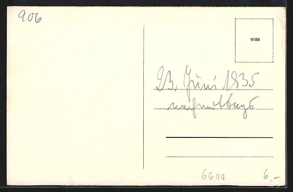 Personenbezogene Daten auf der Rückseite der Karte wurden durch blauen Textmarker unkenntlich gemacht. Die blauen Stellen sind auf die Vorderseite durchgeweicht und wirken sich negativ auf das Postkartenfoto aus