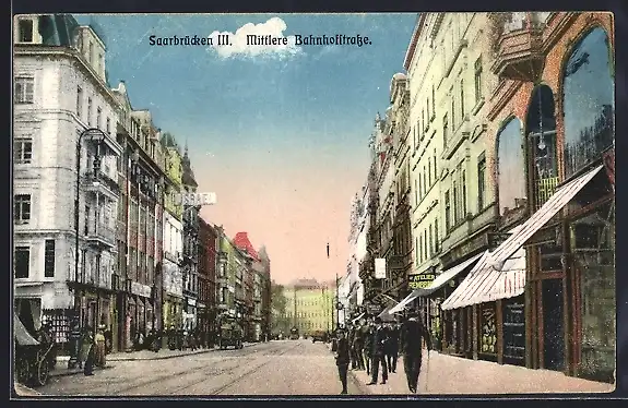 AK Saarbrücken, Mittlere Bahnhofstrasse mit Geschäften