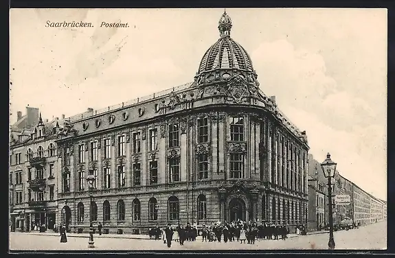 AK Saarbrücken, Postamt, Strassenbahnhaltestelle