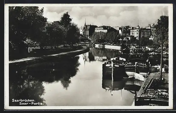AK Saarbrücken, Saar-Partie mit Frachtschiffen