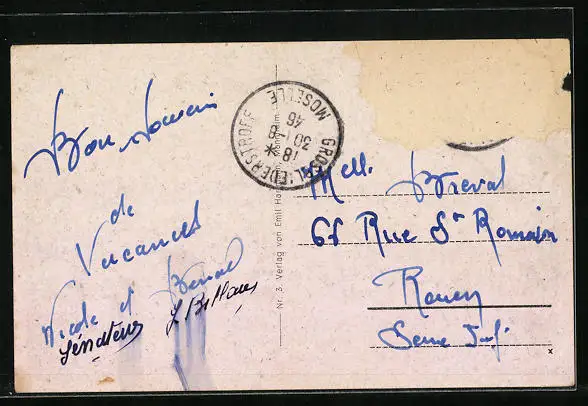 alte Ansichtskarte, gelaufen 1946, Briefmarke entfernt, rückseitig Oberflächenschaden, Kantenschaden li. oben, Einriss li. oben, guter Zustand