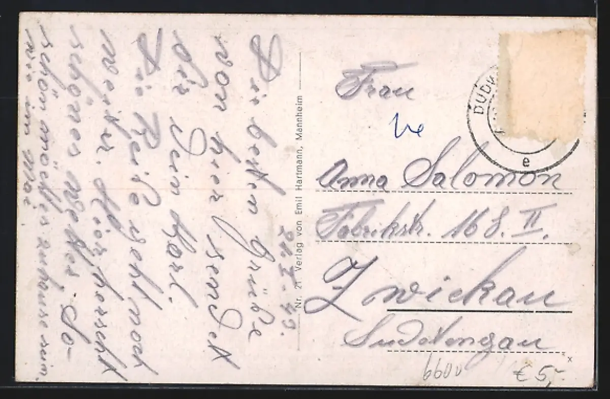 Personenbezogene Daten auf der Rückseite der Karte wurden durch blauen Textmarker unkenntlich gemacht. Die blauen Stellen sind auf die Vorderseite durchgeweicht und wirken sich negativ auf das Postkartenfoto aus