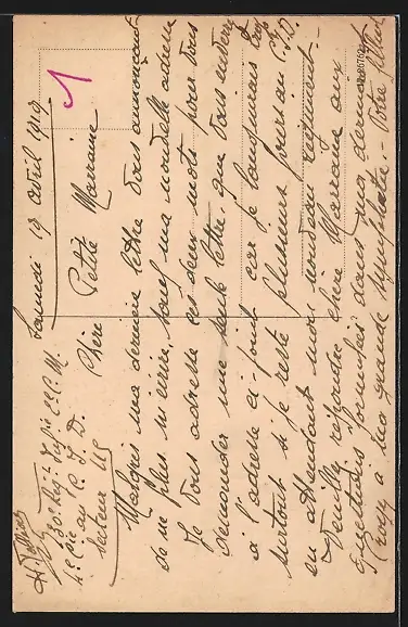 Personenbezogene Daten auf der Rückseite der Karte wurden durch blauen Textmarker unkenntlich gemacht. Die blauen Stellen sind auf die Vorderseite durchgeweicht und wirken sich negativ auf das Postkartenfoto aus