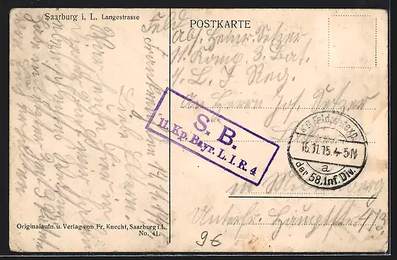 Personenbezogene Daten auf der Rückseite der Karte wurden durch blauen Textmarker unkenntlich gemacht. Die blauen Stellen sind auf die Vorderseite durchgeweicht und wirken sich negativ auf das Postkartenfoto aus