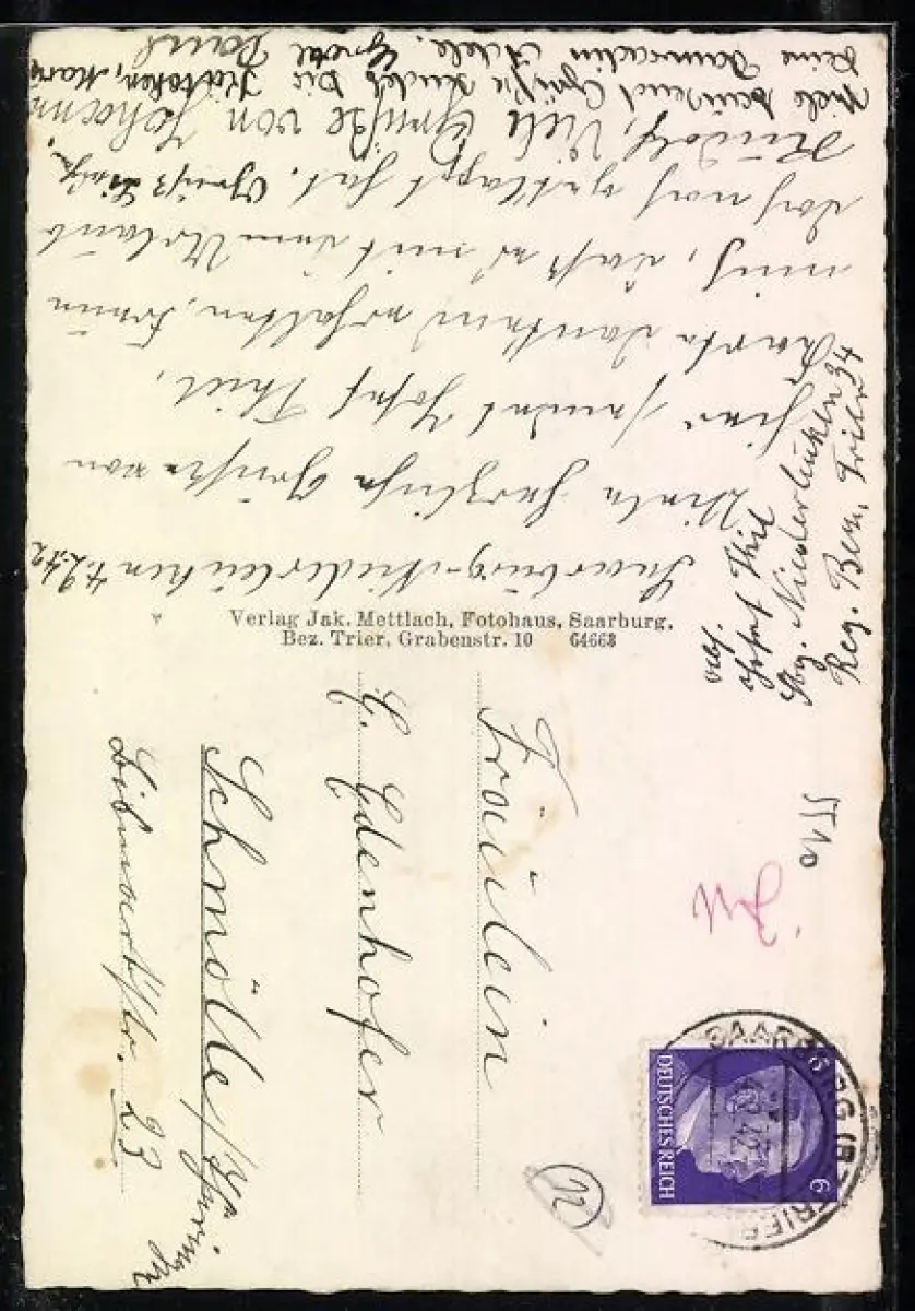 Personenbezogene Daten auf der Rückseite der Karte wurden durch blauen Textmarker unkenntlich gemacht. Die blauen Stellen sind auf die Vorderseite durchgeweicht und wirken sich negativ auf das Postkartenfoto aus