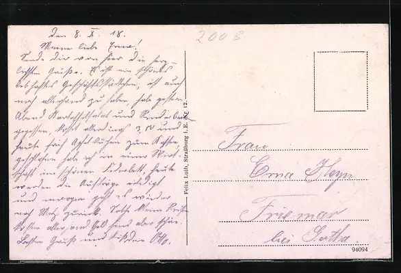 Personenbezogene Daten auf der Rückseite der Karte wurden durch blauen Textmarker unkenntlich gemacht. Die blauen Stellen sind auf die Vorderseite durchgeweicht und wirken sich negativ auf das Postkartenfoto aus