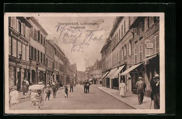 AK Saargemünd /Lothringen, Kreuzstrasse mit Restaurant