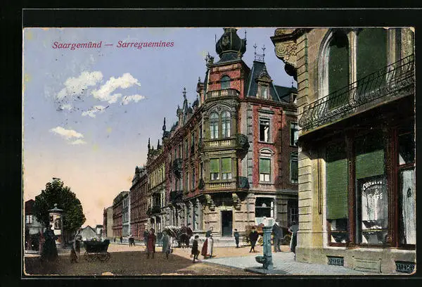 AK Saargemünd, Strassenpartie mit Litfasssäule und Passanten