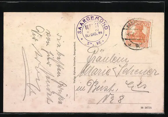 Personenbezogene Daten auf der Rückseite der Karte wurden durch blauen Textmarker unkenntlich gemacht. Die blauen Stellen sind auf die Vorderseite durchgeweicht und wirken sich negativ auf das Postkartenfoto aus