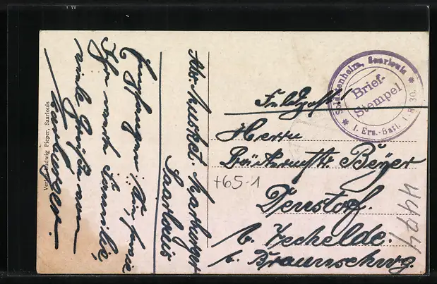 Personenbezogene Daten auf der Rückseite der Karte wurden durch blauen Textmarker unkenntlich gemacht. Die blauen Stellen sind auf die Vorderseite durchgeweicht und wirken sich negativ auf das Postkartenfoto aus