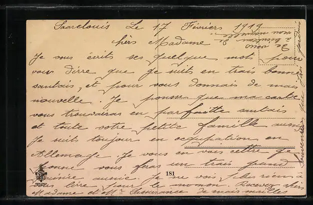 Personenbezogene Daten auf der Rückseite der Karte wurden durch blauen Textmarker unkenntlich gemacht. Die blauen Stellen sind auf die Vorderseite durchgeweicht und wirken sich negativ auf das Postkartenfoto aus