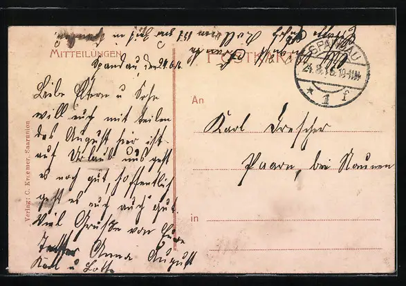 Personenbezogene Daten auf der Rückseite der Karte wurden durch blauen Textmarker unkenntlich gemacht. Die blauen Stellen sind auf die Vorderseite durchgeweicht und wirken sich negativ auf das Postkartenfoto aus