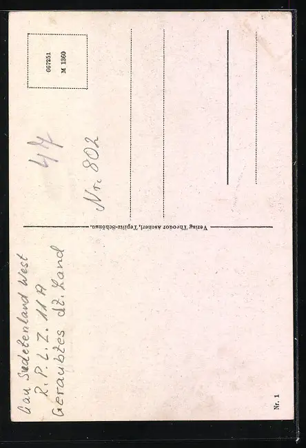 Personenbezogene Daten auf der Rückseite der Karte wurden durch blauen Textmarker unkenntlich gemacht. Die blauen Stellen sind auf die Vorderseite durchgeweicht und wirken sich negativ auf das Postkartenfoto aus