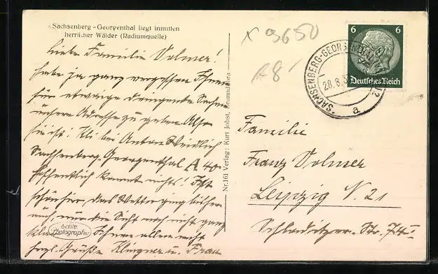 Personenbezogene Daten auf der Rückseite der Karte wurden durch blauen Textmarker unkenntlich gemacht. Die blauen Stellen sind auf die Vorderseite durchgeweicht und wirken sich negativ auf das Postkartenfoto aus