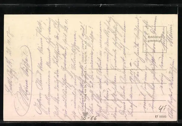 Personenbezogene Daten auf der Rückseite der Karte wurden durch blauen Textmarker unkenntlich gemacht. Die blauen Stellen sind auf die Vorderseite durchgeweicht und wirken sich negativ auf das Postkartenfoto aus