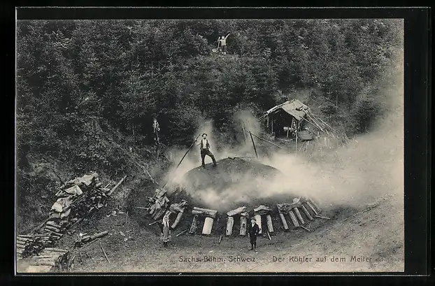 AK Sächs.-Böhm. Schweiz, Köhler steht auf dem Meiler